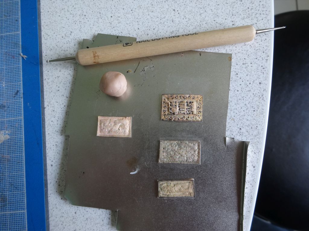 Pour le tampon , un morceau de bois et un morceau de pied d'une chaise .Le tampon en relief est une décoration peinte en noire.